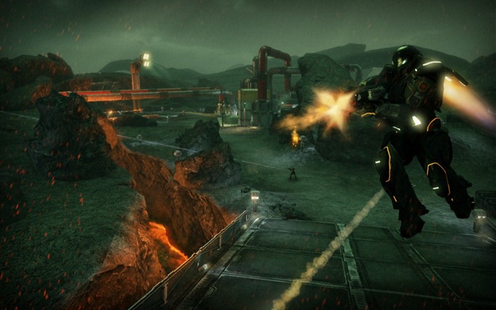 As a single-player, campaign based game, Prejudice fails miserably. The story is hokey, and the encounters aren’t any fun. However few people will buy it for that. You’ll buy this game for it’s multiplayer modes and in that light it’s a surprisingly good buy, especially at $15. The whole ‘launched from a cannon’ respawn mechanic alone makes this game a buzz to play. choosing your landing spot, dodging anti-air cannons and trying to get close to your objectives is fun and the actual decent is a rush. Once on the ground you engage in one of a few different game modes, from Conquest (Battlefield-style capture-and-hold), Assault (similar to Unreal Tournament’s mode of the same name) and Swarm (akin to Gears of War 2’s Horde and Halo Reach’s Firefight).